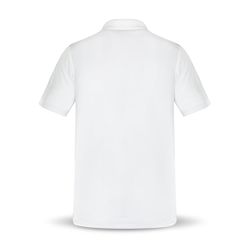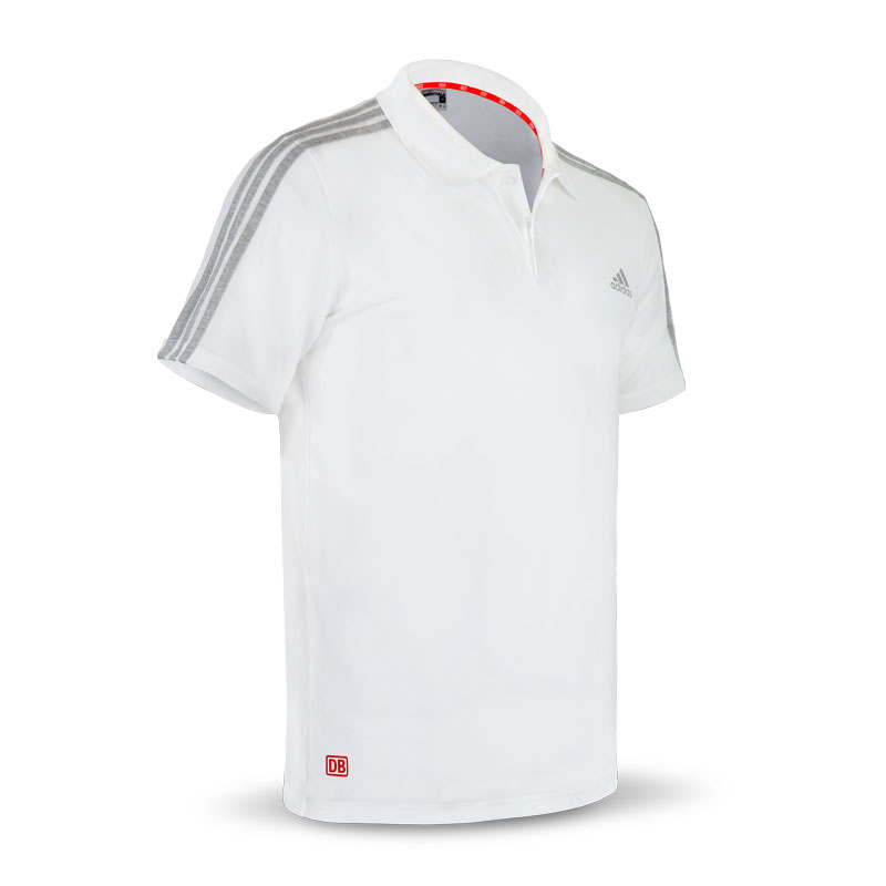 Klassisches tailliert geschnittenes Poloshirt der Firma adidas in der Farbe weiß, mit aufgenähten adidas-Streifen über Schulter und Ärmeln und dezentem adidas- und DB-Branding sowie geripptem Polokragen mit Knopfleiste.