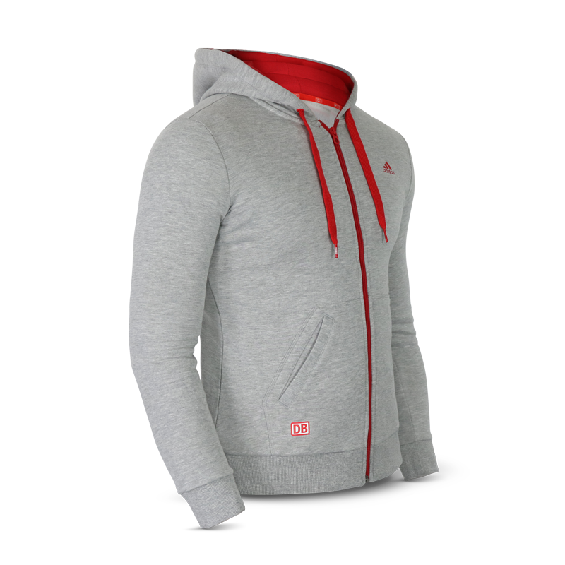 Coole Kapuzen-Sweatjacke der Firma adidas in der Farbe graumeliert mit Akzenten in rot und dezentem adidas- und DB Branding. Seitliche Eingriffstaschen und ein durchgehender Reißverschluss sowie eine Kapuze mit Kordelzug und gerippten Bündchen und Saum machen die tailliert geschnittene Sweatjacke zu einem unverzichtbaren Begleiter.