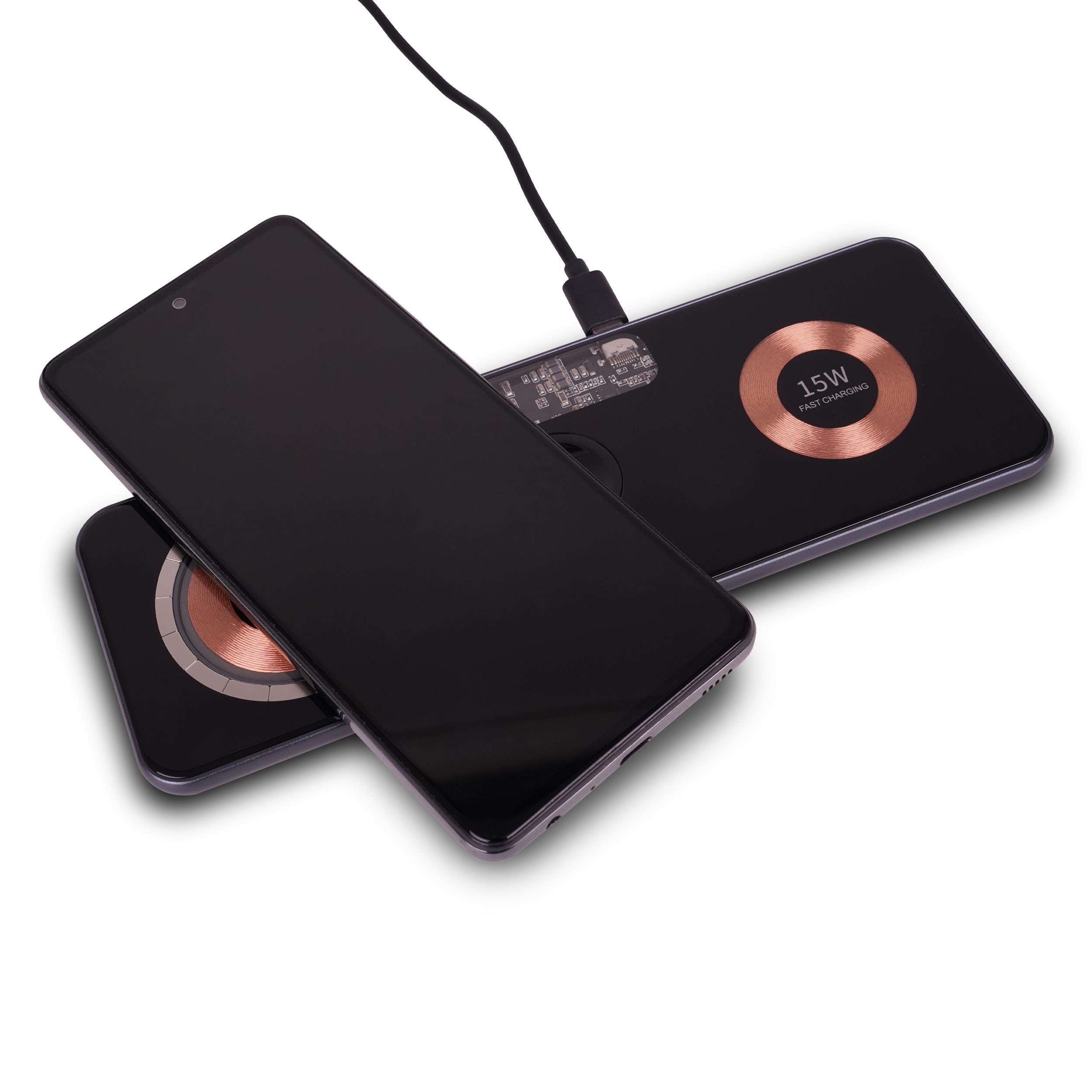 Das superdünne Gehäuse wurde aus Aluminium und gehärtetem Glas gefertigt. Die schwarze, glänzend-glatte Oberfläche sowie die sichtbaren Ladenspiralen aus Kupfer verleihen dem Ladegerät eine Industrial-Optik.