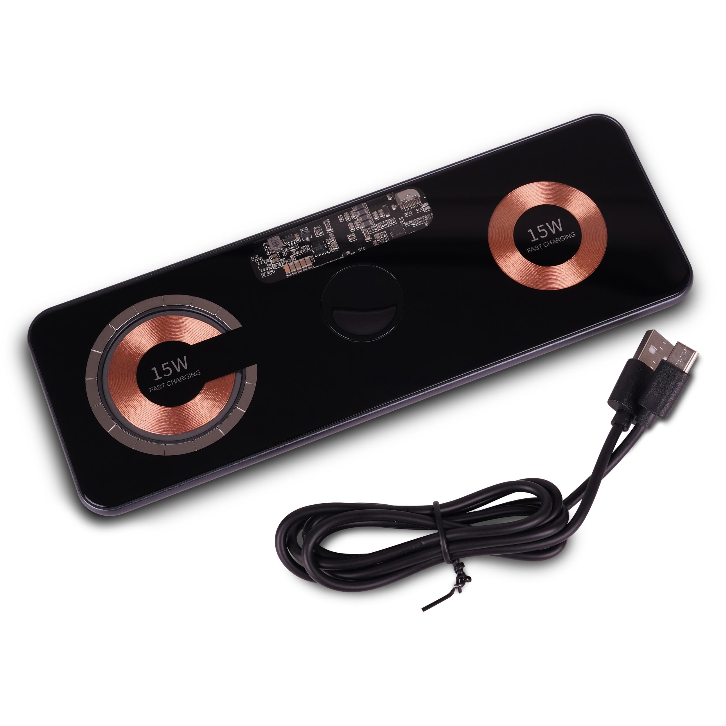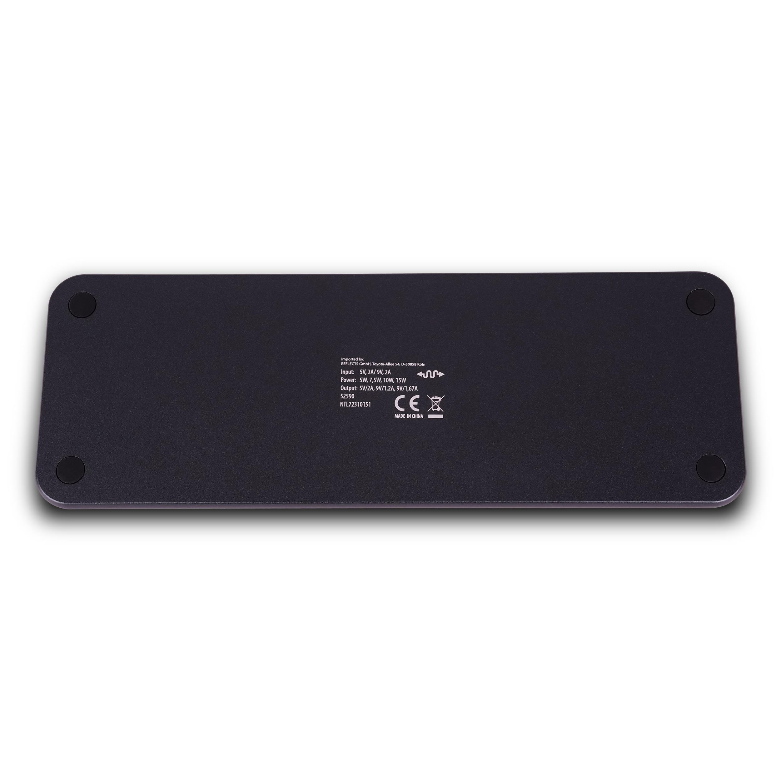 Auf dieser Ladestation können bis zu drei induktive Geräte gleichzeitig aufgeladen werden. Verfügbar sind zwei Ladeflächen mit je bis zu 15 Watt Ausgangsleistung für Handys, Wireless Kopfhörer oder andere Endgeräte. Eine davon ist mit einem Magnetring ausgestattet, der dem Endgerät einen sichereren Halt ermöglicht. Zwischen den beiden Ladeflächen liegt noch eine Ladefläche mit 2,5 Watt, die speziell für Apple® Watch gedacht ist. Mit der hohen Leistung ist das schnelle Aufladen gewährleistet.