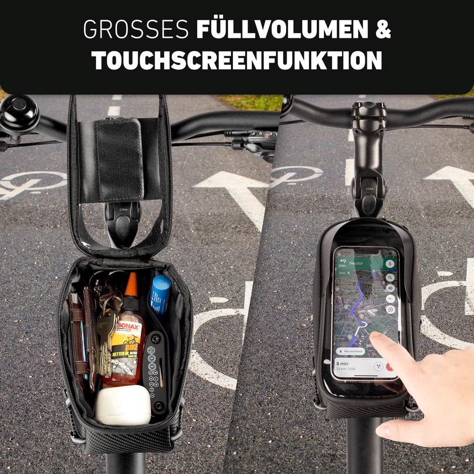 Unsere Frame Bag bietet eine praktische und gut erreichbare Aufbewahrungslösung für unterwegs. Mit einem Volumen von 1,8 Litern lassen sich Smartphone, Werkzeug oder Snacks sicher verstauen, ohne das Fahrverhalten zu beeinträchtigen. Der innovative Adapter ermöglicht eine einfache und schnelle Montage, sodass die Tasche jederzeit flexibel angebracht oder abgenommen werden kann. Dank reflektierender Details bist du auch bei schlechten Lichtverhältnissen besser sichtbar, während die robuste Konstruktion für einen sicheren und stabilen Halt am Rad sorgt.