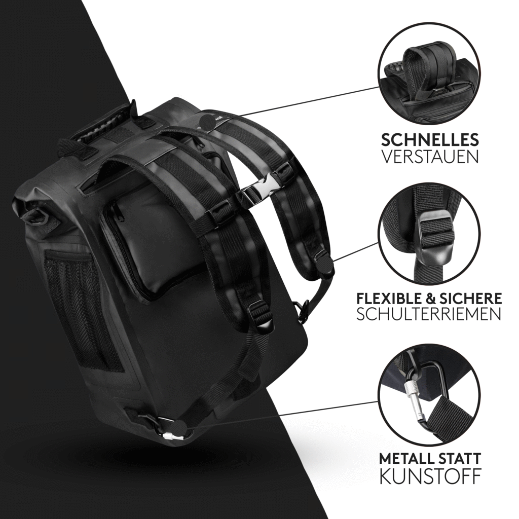 Durch den praktischen Rollverschluss ist deine 3in1 Tasche genauso so groß, wie du sie brauchst. Du kannst sie stark zurollen für ein Volumen von 18L und wenig zurollen für ein Volumen von 25L.