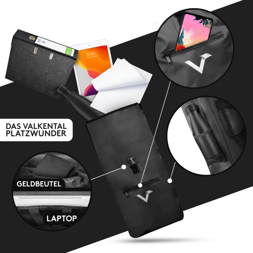 Regen und Schmutz sind für die ValkOne dank des robusten und abweisenden Materials kein Thema. Es ist keine Schönwetter-Tasche, sondern eine Tasche, die auch für die unangenehmen Fahrten durch das deutsche Wetter entwickelt wurde. Zudem sind die Valkental Logos gleichzeitig Reflektoren, sodass man im Straßenverkehr gut gesehen wird.