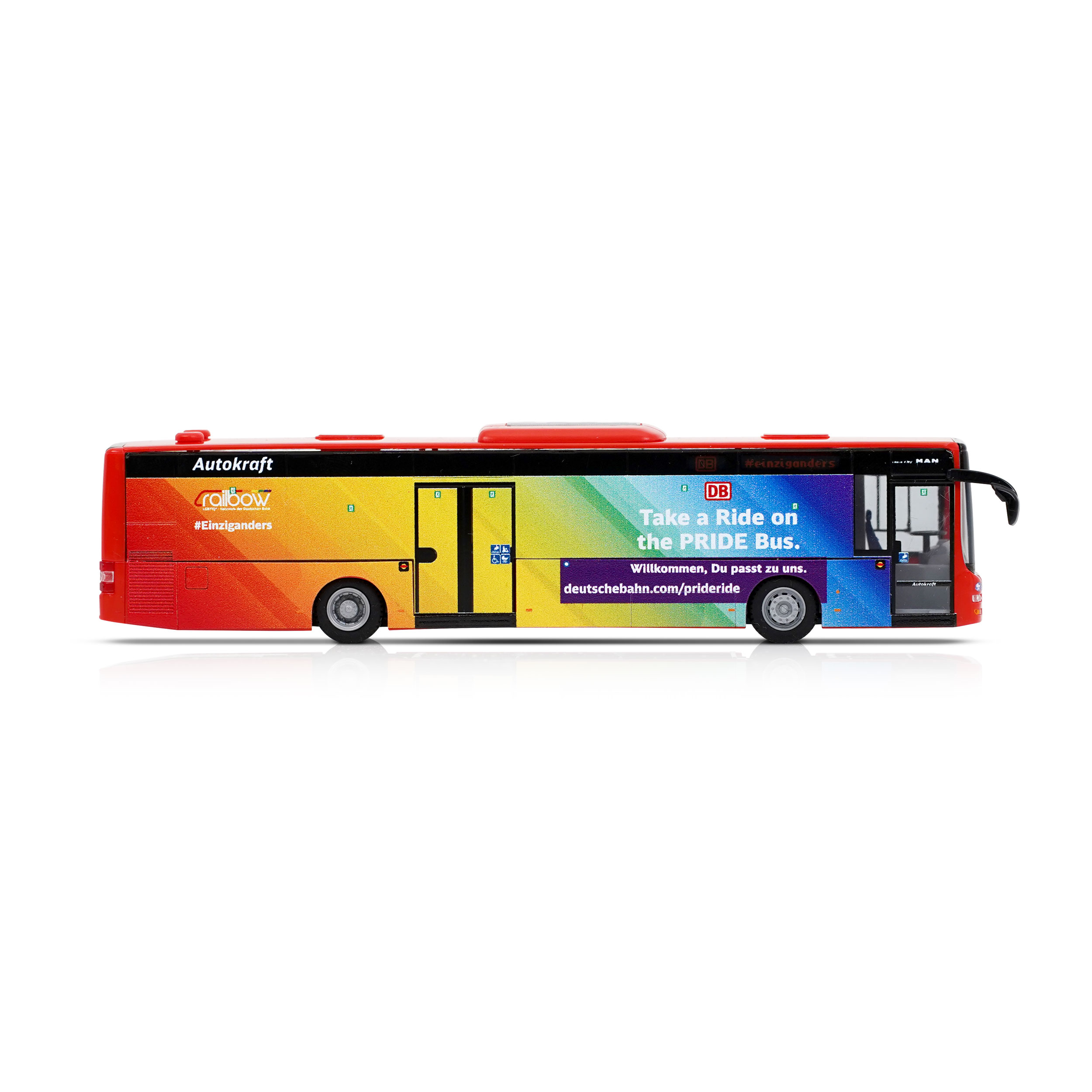 Umfangreich bedrucktes Bahnbus-Modell im PRIDE-Design.