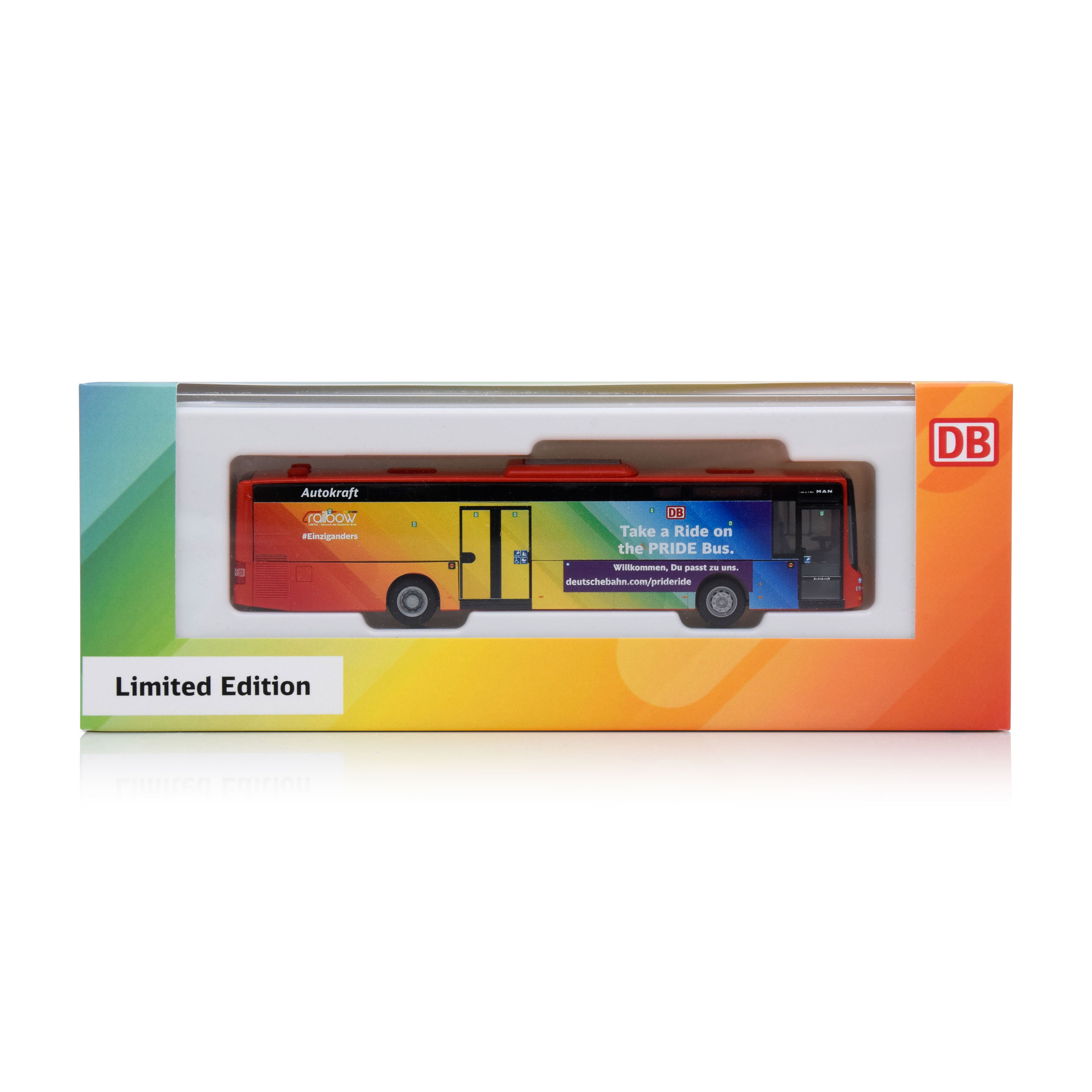 Umfangreich bedrucktes Bahnbus-Modell im PRIDE-Design.