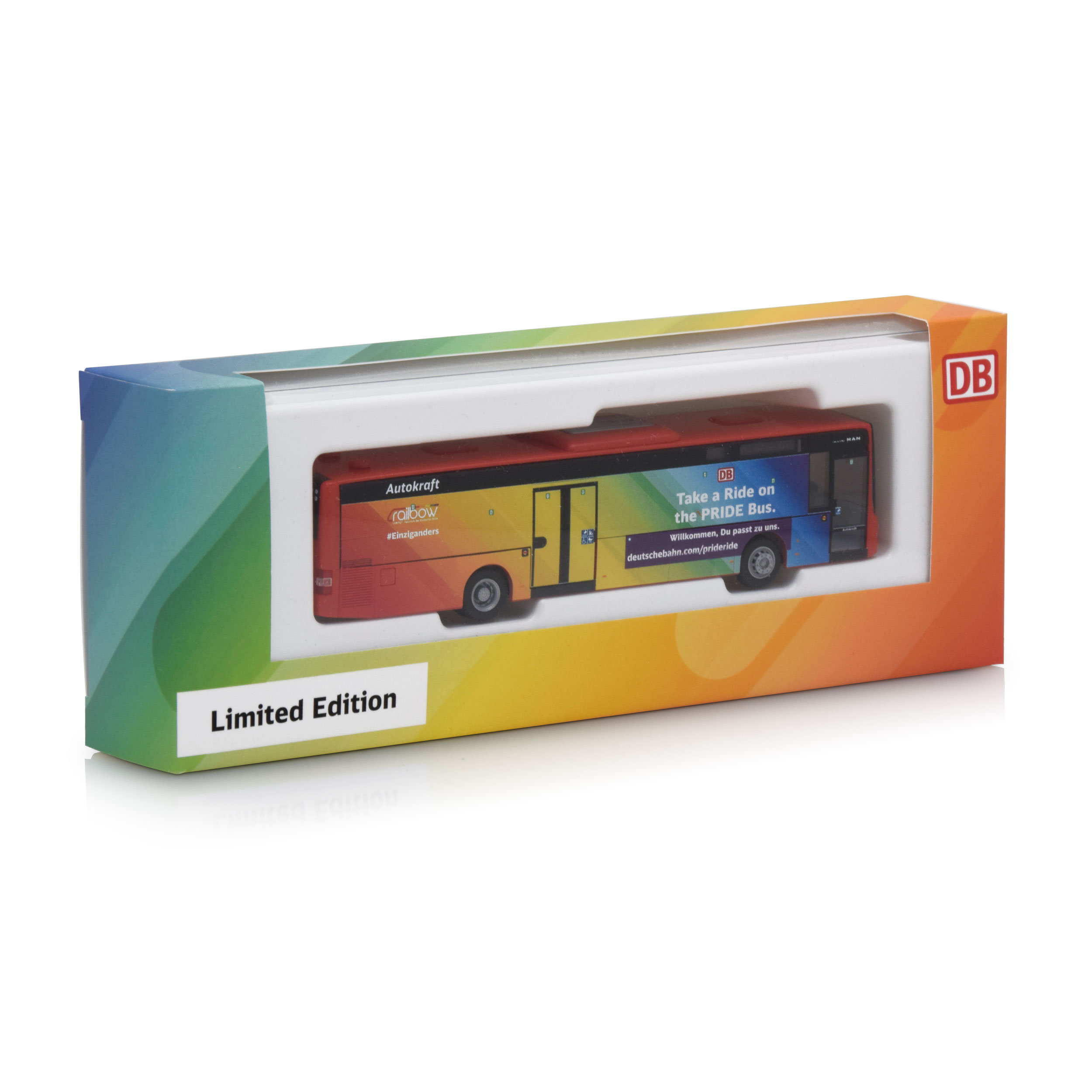 Umfangreich bedrucktes Bahnbus-Modell im PRIDE-Design.